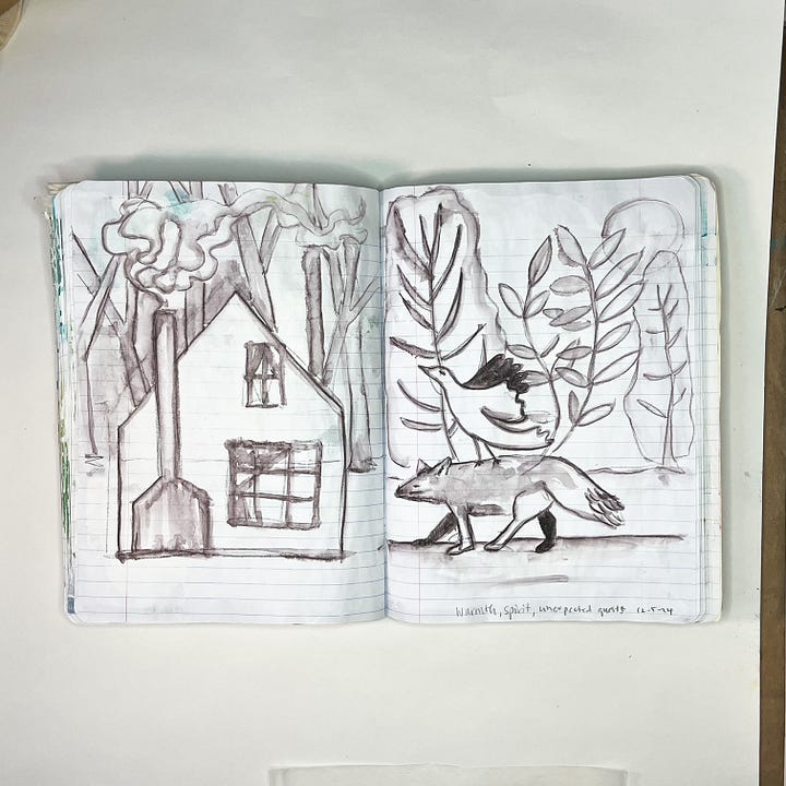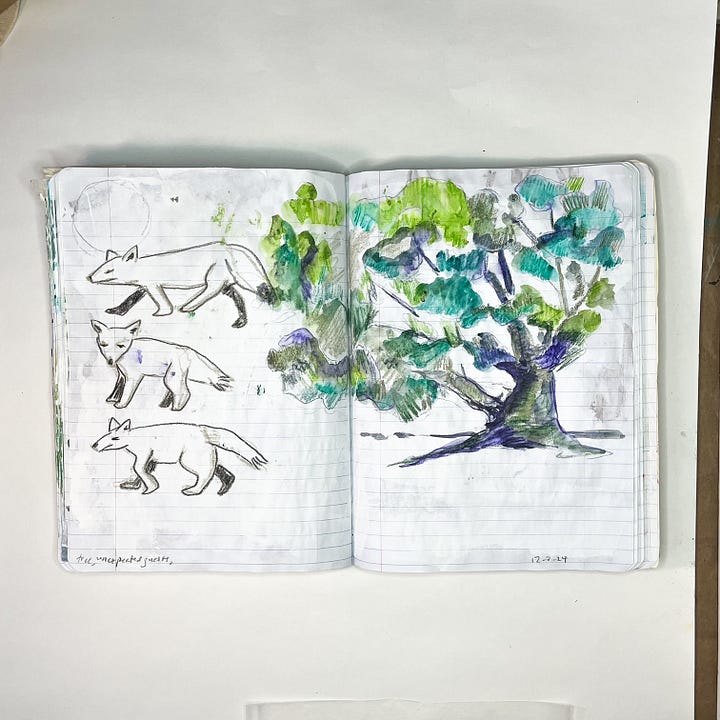 I drew some foxes in November (original images from Emma Carlise’s Patreon), and was thinking of these creatures as the unexpected guests prompt. Including a house with a cozy fire and tree sketch to round out these prompts.
