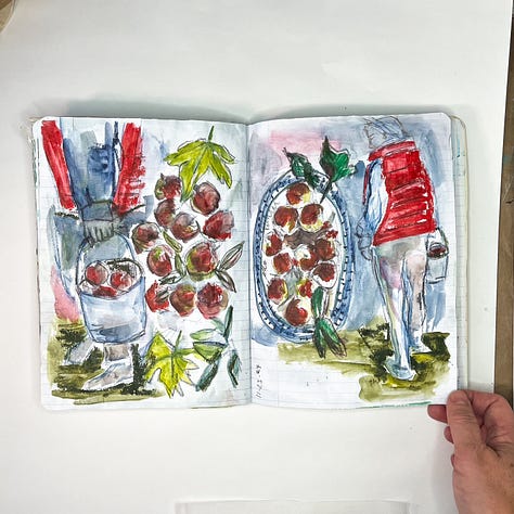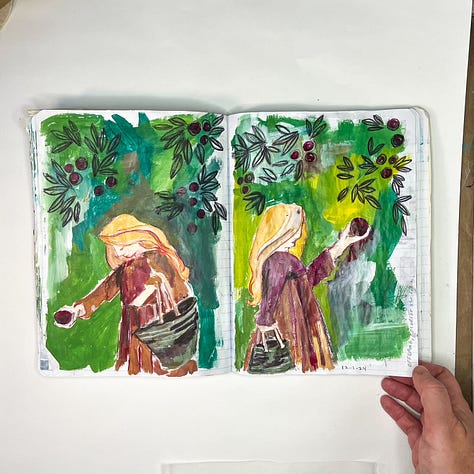 These apple picking drawings are from images that Emma Carlisle shared on her Patreon in November. I like how the middle one looks like an offering.