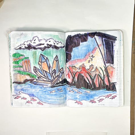 This week I got started with the drawings. I am aiming to finish up a few sketchbooks that very close to being filled up. These drawings are in a composition notebook I’ve been using this year for random drawings and collages. I gesso the pages lightly to give it some tooth for the pencil. Still the pages don’t take the wet media well. Watercolor in the first image is not great, acrylic in the second is better, and I used pencils and markers for the last image.