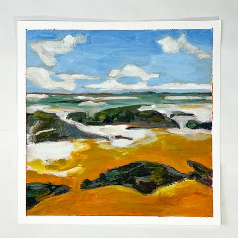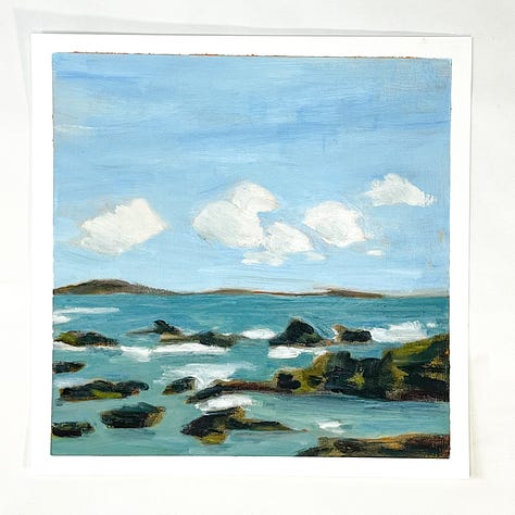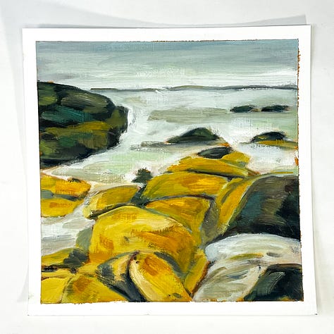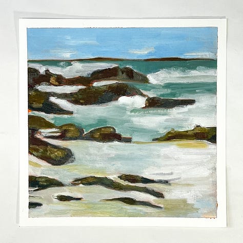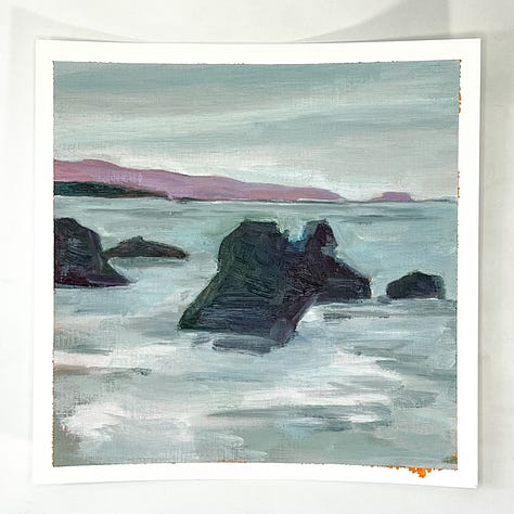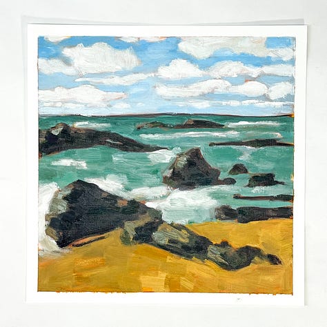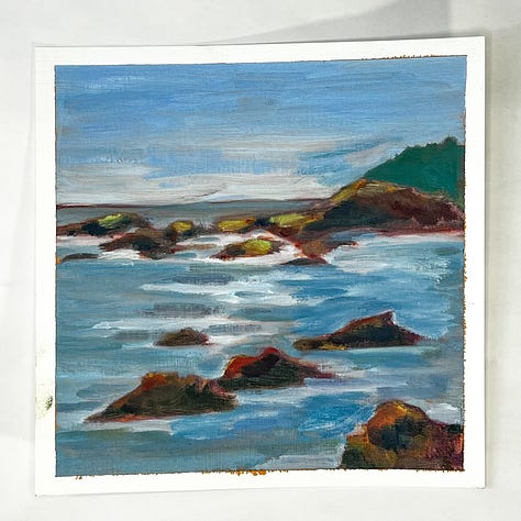 This month started off a little slow. I was sort of stuck on one image that just didn’t turn out. I did three paintings of it, but honestly don’t love any of them enough to count as a part of the 100. It got me a little hung up until mid-month when I tried to think a bit about what sort of image I like painting, as a way to snap out of the rut. So I found a few rocky oceanscapes on Unspalsh and it got me going again.